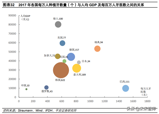 患者的消費能力和醫(yī)生數(shù)量是制約種植和正畸滲透率提升的主要因素。以種植為例,我國種植牙滲透率較低,每萬人種植牙數(shù)量僅10個,而世界主要的平均水平大概在100左右。分析發(fā)現(xiàn),種植牙滲透率主要跟消費能力和種植醫(yī)生數(shù)量兩個因素有關,前者代表支付能力,后者代表服務供給能力。韓國每萬人種植牙數(shù)量高達622個,主要是由于2014年開始牙科保險覆蓋更多的高端人群。此外,在韓國70%以上的牙醫(yī)都能開展種植手術,而我國這一比例偏低。巴西雖然人均GDP與我國在同一水平,但由于其龐大的牙科醫(yī)生數(shù),導致種植醫(yī)生數(shù)量多。