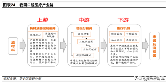 三、口腔產(chǎn)業(yè)鏈:上游關注高值耗材,下游重視連鎖化口腔醫(yī)療產(chǎn)業(yè)鏈主要分為上游、中游和下游。上游為耗材及器械制造商,口腔行業(yè)耗材產(chǎn)品種類多,主要分為低值耗材、高值耗材及設備。前者多數(shù)市場空間較小,且競爭格局差,后者目前仍以歐美品牌占主導,國產(chǎn)替代率較低;中游目前在國內(nèi)口腔醫(yī)療產(chǎn)業(yè)鏈的占比較低,以傳統(tǒng)的各級經(jīng)銷商為主,但近年來國內(nèi)開始逐漸出現(xiàn)新型的DSO模式;下游就是各類口腔醫(yī)療服務機構(gòu),如前文所述,主要包括綜合醫(yī)院口腔科、口腔醫(yī)院、私人診所和連鎖診所四大主要類別。當前我國口腔醫(yī)療機構(gòu)處于區(qū)域連鎖向全國連鎖過渡的階段,整體連鎖率較低。