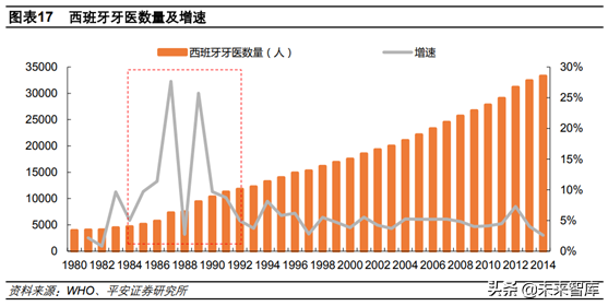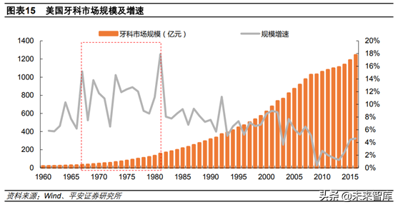 從歐美經(jīng)驗來看,我國口腔醫(yī)療也到了快速發(fā)展的關口。美國牙科醫(yī)療消費市場規(guī)模在1967-1981年間增速快,CAGR達11.44%,在此期間人均GDP由4327美元提升到13943美元。而歐洲由于經(jīng)濟發(fā)展水平不同,口腔醫(yī)療爆發(fā)節(jié)點有所差異,我們以西班牙為例,其口腔醫(yī)療在1980年之后,尤其是1984-1992年之間快速增長,這段時間也是其人均GDP快速提升的階段,由4478美元提升至16086美元,CAGR達17.32%。因此,無論從臺灣,還是歐美發(fā)展經(jīng)驗看,當前我國經(jīng)濟發(fā)展水平足以支撐我國口腔醫(yī)療的快速起步。
