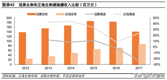 生物膜主要用于硬腦(脊)膜缺損的修復。該品種市場競爭較為激烈,國內(nèi)廠家主要有天新福、冠昊生物,進口產(chǎn)品主要有強生和貝朗。目前天新福、冠昊生物和正海生物市占率居前三位,國外品牌相對靠后。國內(nèi)硬腦膜市場在50-60億,相對成熟,行業(yè)增速不到10%,前三家企業(yè)市場規(guī)模在10-15億。2017年正海生物硬腦膜銷售8631萬元,同比增長24%,而同期冠昊生物銷售1.4億元,同比下滑23.38%,我們預計正海生物市占率將逐步實現(xiàn)超越。未來腦膜競爭格局的改變主要依靠新材料的出現(xiàn),公司正在研發(fā)新一代生物膜,其上市后將加快對現(xiàn)有產(chǎn)品的替代。