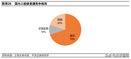 口腔生物膜方面國內(nèi)競爭格局良好,進口產(chǎn)品瑞士蓋氏占據(jù)70%的市場份額,正海生物約占10%,憑借價格優(yōu)勢有望逐步實現(xiàn)進口替代,其他如韓國的品牌則在品種和價格上參差不齊。骨修復材料方面,市場主要由瑞士GeistlichPharmaAG的產(chǎn)品占據(jù),公司產(chǎn)品2015年獲批上市,處于市場開拓階段,銷售規(guī)模較小,但伴隨著種植牙行業(yè)的快速發(fā)展,有望保持30%以上的增速。