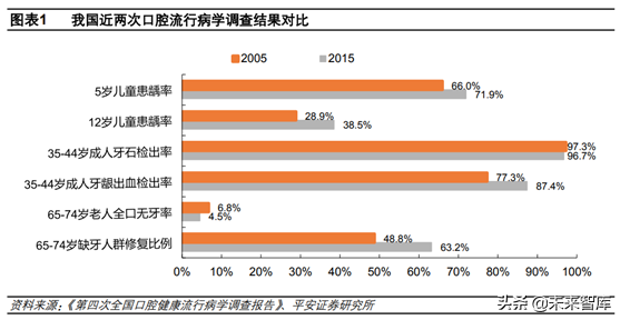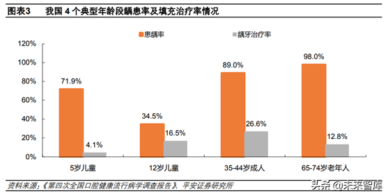 口腔疾病診療率低,發(fā)展?jié)摿薮蟆?/strong>“牙疼不是病”充分說明了在我國口腔問題長期不受重視,面對口腔問題一貫的做法是“忍一忍就過去了”,口腔健康觀念的落后導致我國口腔患者診療率低。根據(jù)口腔流行病學調(diào)查結(jié)果,5歲兒童、12歲兒童、35-44歲成人、65-74歲四個年齡段齲齒填充調(diào)節(jié)率僅分別為4.1%、16.5%、26.6%、12.8%,四個年齡段調(diào)節(jié)率均遠遠小于齲患率。