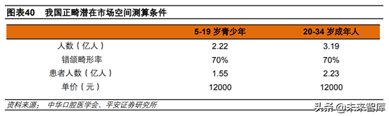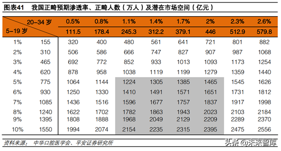 我國正畸市場潛在市場空間在2000億元以上:1)2000年中華口腔醫(yī)學會正畸專業(yè)委員會調(diào)查得知我國錯頜畸形整體患病率為67.82%,較上世紀60年代提升30%-40%,呈上升趨勢。我們假設當前我國錯頜畸形患病率在70%左右;2)正畸通常有兩個年齡段,一是5-19歲的青少年,二是20-34歲的成年人,35歲以后正畸病例較少。目前我國正畸病例200萬例左右,參照我國5-19歲和20-34歲兩個年齡段3.78億的潛在患者人數(shù),滲透率僅約0.5%;3)正畸客單價按12000元計算。參考國外情況,我們保守估計5-19歲滲透率在5%-10%之間,20-34歲滲透率在1.1%-2%之間,則我國正畸市場潛在市場空間在1224億-2395億元之間,仍有5-10倍的成長空間。
