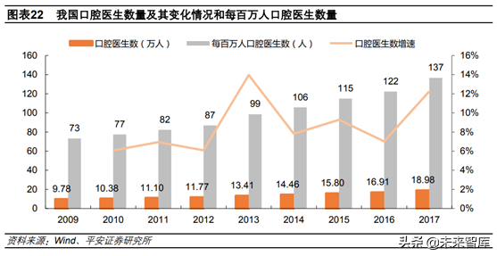 3)口腔醫(yī)生數(shù)量增長提速,醫(yī)療服務能力加強。2017年我國共擁有口腔科醫(yī)生18.98萬人,同比增長12.25%。每百萬人口擁有口腔醫(yī)生137人,相當于臺灣地區(qū)1982年的水平,彼時臺灣口腔醫(yī)療行業(yè)剛剛起步。同時,從2013年開始我國口腔醫(yī)生數(shù)量增速提升,服務能力持續(xù)增強,為口腔行業(yè)騰飛奠定基礎。