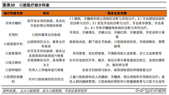 口腔診療是醫(yī)療機構(gòu)為消費者提供口腔疾病診斷、調(diào)節(jié)和口腔保健等服務。從科室上看,口腔醫(yī)療又可以進一步細分為牙體牙髓科、牙周科、口腔頜面外科、口腔修復科、口腔正畸科、口腔種植科、口腔預防保健科等。