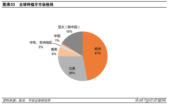 我國種植市場僅占1%。由于我國當前種植牙滲透率較低,種植市場規(guī)模僅占的1%左右。而歐洲和美洲憑借較高的滲透率,占比分別高達47%和28%。