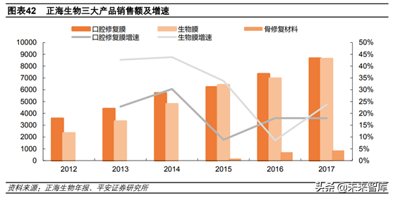 正海生物是國內(nèi)生物再生材料領域龍頭,主要有三大產(chǎn)品,分別為生物膜、口腔修復膜和骨修復材料,重點應用于神經(jīng)外科、口腔科和骨科。其中口腔修復膜和骨修復材料應用場景之一就是種植牙,我國大概有一半的種植牙患者存在骨量不足的情況,需要添加骨修復材料,而口腔修復膜則是用于口腔軟組織淺層缺損的修復,兩者可配合使用。2017年公司生物膜、口腔修復膜和骨修復材料分別實現(xiàn)銷售額8631萬元、8671萬元和839萬元,分別同比增長23.71%、17.96%和21.95%,保持高速增長。2017年三大產(chǎn)品占收入比例高達99%。