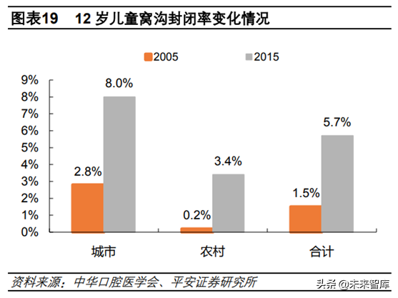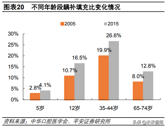 2)居民口腔健康觀念不斷提升。在口腔醫(yī)療潛在需求旺盛,支付能力有的前提下,我國口腔行業(yè)發(fā)展的掣肘因素之一就是居民口腔健康觀念。隨著80、90后成為社會中堅力量,消費主力對新事物接受程度提高。根據(jù)近兩次口腔健康流行病學調(diào)查結(jié)果看,無論是12歲兒童窩溝封閉率還是各年齡段的齲補比例都有顯著提升。