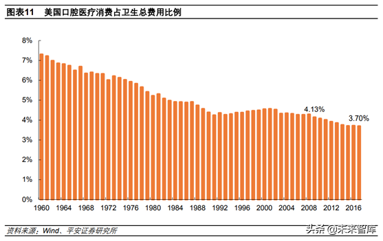 我國潛在口腔醫(yī)療市場在2000億以上。2017年美國口腔醫(yī)療消費占衛(wèi)生總費用的比例為3.70%,但美國衛(wèi)生總費用的持續(xù)增長導致口腔醫(yī)療消費占比呈下降趨勢。美國口腔醫(yī)療市場規(guī)模增速2009年開始低于5%,我們認為進入成熟期,當年口腔消費占衛(wèi)生總費用的比例為4.13%,按此比例計算,目前國衛(wèi)生總費用對應的內(nèi)口腔醫(yī)療市場規(guī)模達到2172億元。而考慮到我國衛(wèi)生費用的持續(xù)增長,我國口腔醫(yī)療市場應遠不止如此。