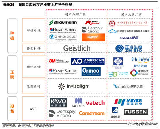 口腔醫(yī)療的上游為耗材和設備生產(chǎn)商,其中低值耗材由于單品空間有限,廠家眾多,基本以價格競爭為主,投資價值有限。我們認為在上游重點關注種植和正畸領域的高值耗材和相關設備,這些領域目前均由進口品牌主導,進口替代空間大,且單品市場價值高。