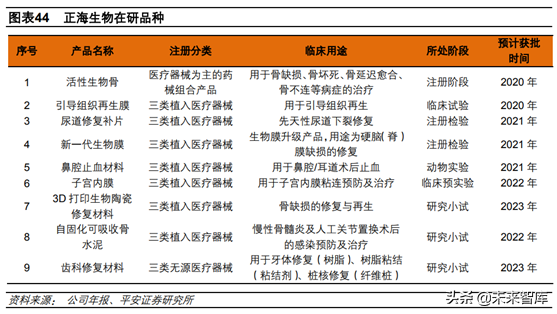 后續(xù)研發(fā)方面,重磅品種活性生物骨注冊獲得藥監(jiān)局受理?;钚陨锕菍儆谒幮到M合產(chǎn)品,注冊壁壘較高,公司先發(fā)優(yōu)勢,我們預計活性生物骨有在2020年落地。國外擁有活性生物骨產(chǎn)品的企業(yè)以美敦力和史賽克為代表,年銷售額在10億美元以上,且尚未在國內(nèi)上市。除活性生物骨外,公司還啟動了引導組織再生膜、新一代生物膜等新產(chǎn)品的梯隊研發(fā),其中引導組織再生膜在進行臨床試驗,預計2020年獲得注冊證,有望成為新的業(yè)績增長點;新一代生物膜在注冊檢驗,預計2021年獲得注冊證;另外子宮內(nèi)膜修復材料是潛在大品種,考慮到人工流產(chǎn)和剖腹產(chǎn)人群龐大,市場規(guī)模比現(xiàn)有品種高出一個數(shù)量級,預計在3-4年內(nèi)拿到注冊證書。其他品種如尿道修復補片、鼻腔止血材料等有望在2021年獲批。