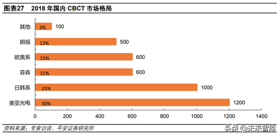 相關設備領域主要有口腔CBCT(ConeBeamCT,錐形束CT),與傳統(tǒng)CT相比具有掃描時間短、空間分辨率高和放射性低等優(yōu)勢。伴隨種植和正畸的快速增長,CBCT的使用越來越多。2012年以前我國口腔CT行業(yè)主要由高品質(zhì)、高性能、高價格的國外品牌占領,包括Kavo、日本Morita、DentsplySirona、科銳等,主要面向病人量大、臨床要求高的公立醫(yī)院。但近年來以美亞光電為首的國產(chǎn)品牌逐漸掌握CBCT的核心技術并實現(xiàn)量產(chǎn),成本下降帶動價格下降,國內(nèi)品牌零售價約30萬元,市場競爭度日趨提高,國外CBCT價格則不再居高不下,從100萬元以上下降到50-150萬元。2018年美亞光電占國內(nèi)市場份額30%左右,2013年到2017年銷售量年復合增長率達到101%,主要面向民營專科醫(yī)院和口腔診所,渠道下沉釋放基層醫(yī)療設備需求。