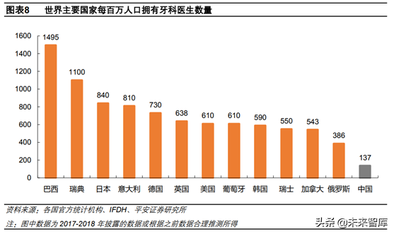 我國口腔醫(yī)師資源稀缺,人均牙醫(yī)數(shù)量與發(fā)達差距。口腔醫(yī)生是口腔醫(yī)療服務的實際提供者,其數(shù)量代表了一個口腔醫(yī)療資源水平。目前從世界主要來看,發(fā)達每百萬人口牙醫(yī)數(shù)量大致在500-1000之間。根據(jù)2018年巴西聯(lián)邦牙科委員會(CFO)數(shù)據(jù),巴西牙醫(yī)數(shù)量已達到31萬人,每百萬人擁有牙醫(yī)數(shù)達到1495人,為數(shù)量多的。與我國人種和文化相近的日本和韓國分別達到840人和590人。而我國僅137人,與上述差距顯著,擁有巨大的提升空間。