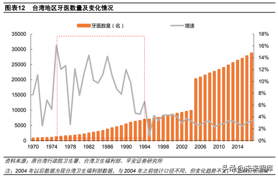 1975-1994是臺灣地區(qū)口腔醫(yī)療發(fā)展快的20年。我們以口腔醫(yī)師總數(shù)代表口腔醫(yī)療發(fā)展程度,1975-1994這20年是臺灣地區(qū)口腔醫(yī)生數(shù)量增速快的區(qū)間,CAGR達到10%。在此期間,臺灣地區(qū)人均GDP由985美元提升至12160美元。每百萬人口擁有牙科醫(yī)生數(shù)由75人提升至330人。我們認為這段時間臺灣牙科醫(yī)療發(fā)展迅猛,一是由于這段時間臺灣人均GDP快速提升,年復合增速達到13%,口腔醫(yī)療消費能力大幅提升;二是臺灣地區(qū)受日韓等影響,以及本地區(qū)對于牙科教育的重視,民眾口腔健康觀念和牙科醫(yī)療服務水平顯著提升;三是1975年臺灣實施《新醫(yī)師法》,賦予了牙科醫(yī)生法律地位,牙科醫(yī)生社會地位隨之提升。