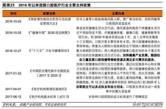 4)近幾年支持政策不斷出臺。2016年以來我國不斷出臺口腔行業(yè)相關支持政策,其中《“十三五”衛(wèi)生健康規(guī)劃》提出的鼓勵社會力量發(fā)展口腔保健,以及《醫(yī)療機構(gòu)管理實施細則》提出的在職醫(yī)生可以多點執(zhí)業(yè)和自主創(chuàng)業(yè)顯著利好口腔醫(yī)療行業(yè)發(fā)展。
