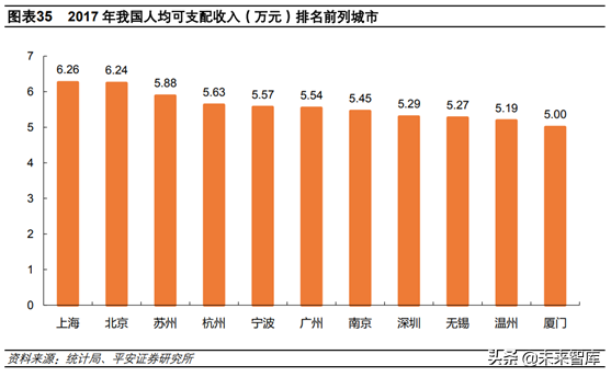 我國主要一二線城市人均可支配收入已經(jīng)達到或接近9000美元。2017年上海和北京城鎮(zhèn)居民人均可支配收入分別為6.26萬和6.24萬元,按2017年平均匯率計算分別為9300美元和9200美元。此外,蘇州、杭州、寧波、廣州、南京、深圳等城市均接近9000美元。