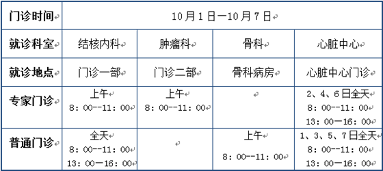 【內(nèi)科門診】:10月1日至10月7日上午有專家門診,全天有普通門診。