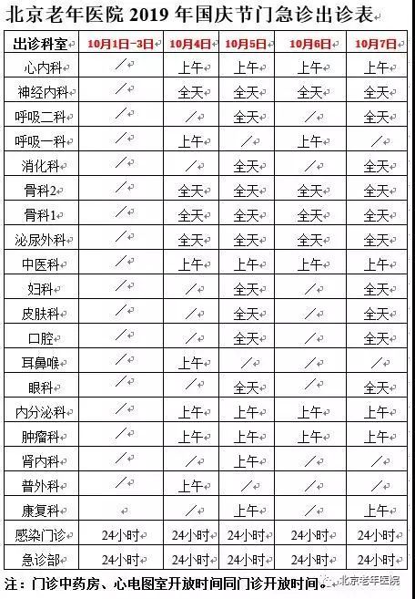 10月1日(國慶節(jié))~10月3日:門診為上午半日門診(綜合科、老年科、乳腺科、內(nèi)分泌科、男科、疼痛科、推拿科、營養(yǎng)門診停診)。