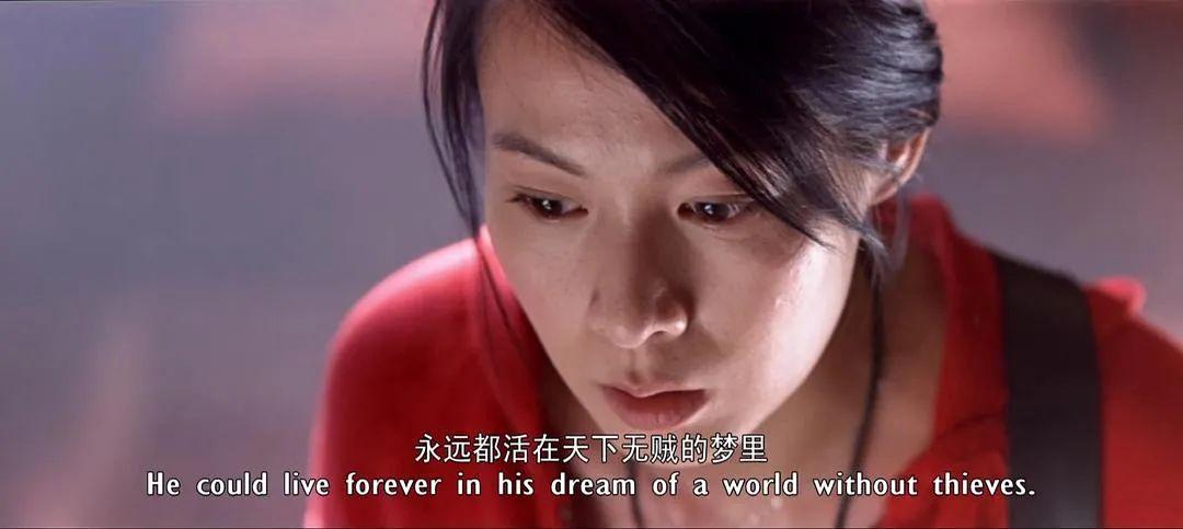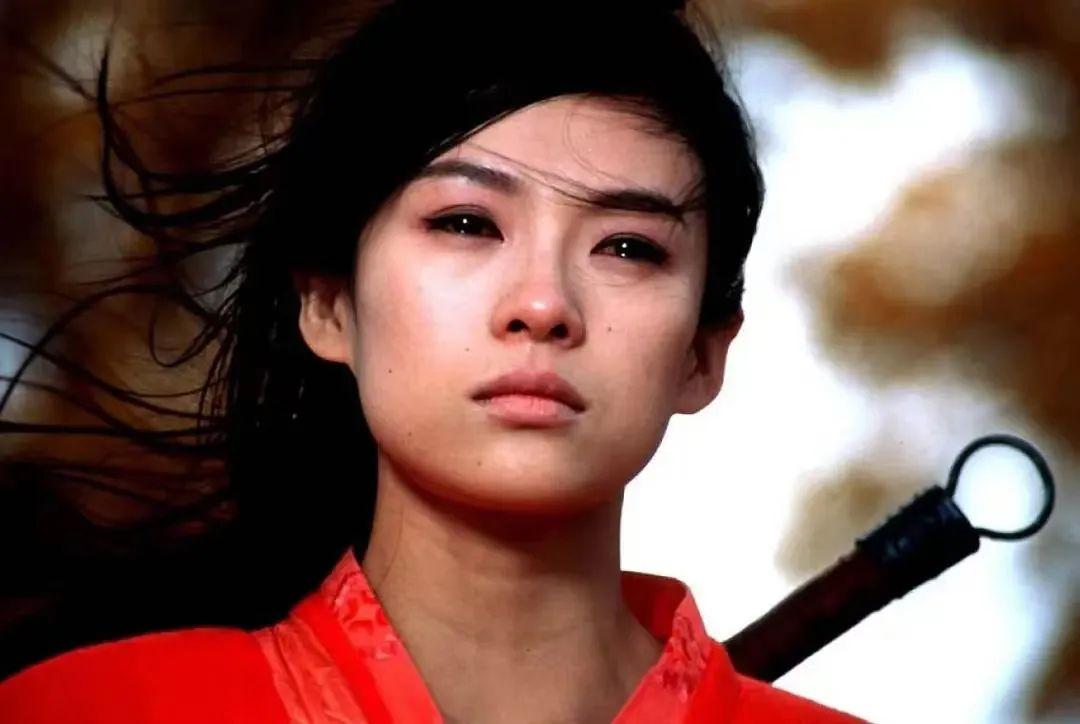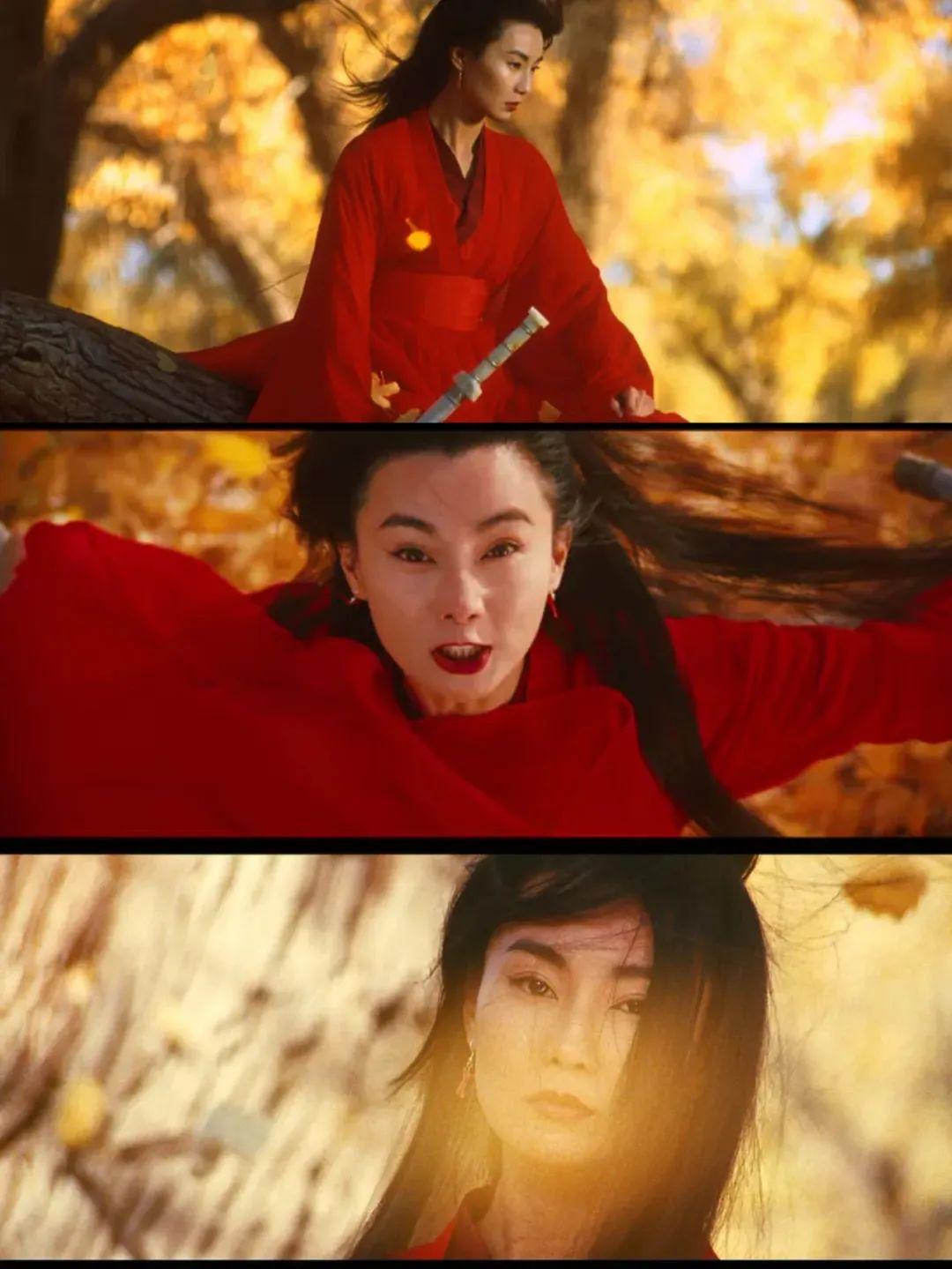 張曼玉紅唇襯紅衣,黑發(fā)隨風(fēng)飛起,再加上凌厲銳氣的眉眼線條,處處彰顯出俠女殺伐果決的氣場(chǎng)和快意恩仇的胸襟。