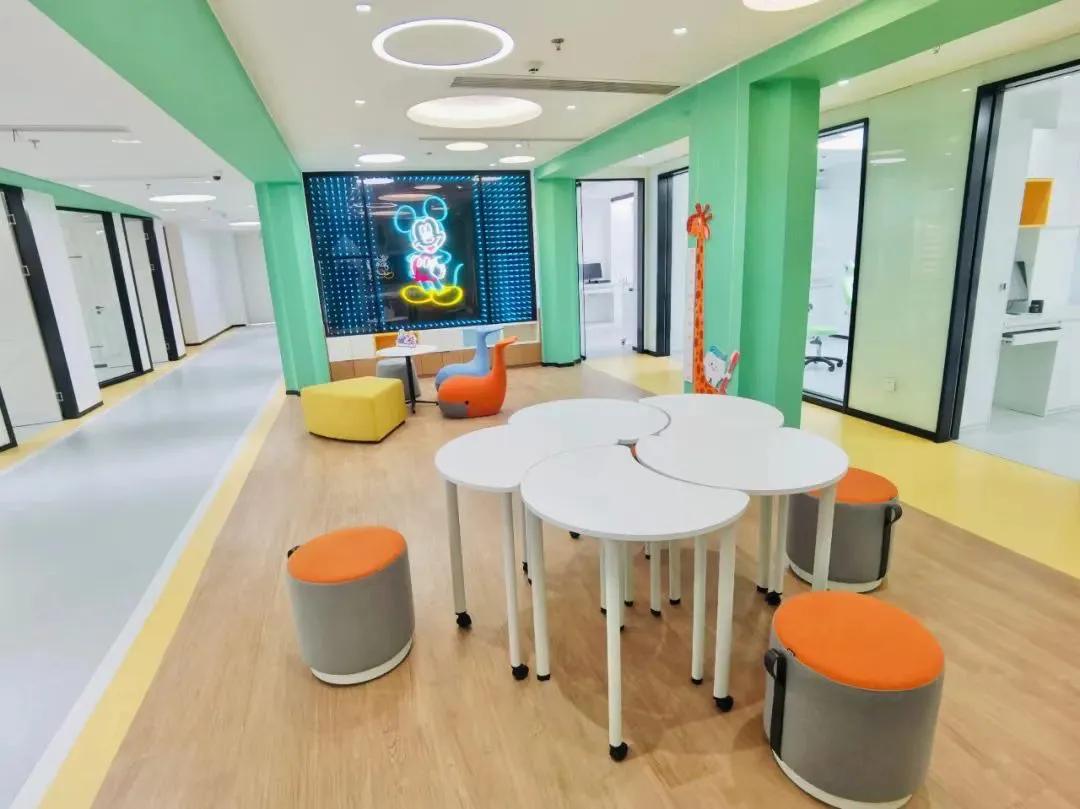 尤其在兒童診區(qū),裝修上不僅有兒童喜歡的米奇燈飾、星空屋頂、橘色沙發(fā)、花瓣桌子、小海豚座椅、兒童洗水池等,就是診室的牙椅、柜子也采用鮮亮的顏色,看著更像是好玩的游玩區(qū),讓孩子不再抗拒看牙。